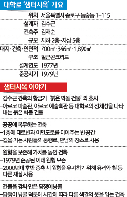 지하철 4호선 혜화역 2번 출구를 나와 고개를 돌리면 담쟁이넝쿨로 둘러싸인 붉은 벽돌 건축물이 나온다. 건축가 고(故) 김수근씨가 1977년에 설계해 1979년에 완공된 대학로 '샘터 사옥'이다. 젠트리피케이션의 원조로 불리는 대학로에는 하루가 다르게 오래된 건물이 물러나고 새로운 건물이 올라서고 있다. 하지만 이 같은 변화 속에서도 샘터는 세월의 흔적을 간직하며 오래도록 한 자리를 지키고 있다. 샘터는 1956년부터 반세기가 넘도록 한 자리를 지키고 있는 길 맞은편의 '학림다방'과 함께 대학로를 지키는 상징과도 같은 건물이다. 승효상 이로재 대표는 샘터에 대해 "대학로의 역사를 증언하는 건축물"이라고 평했다.
