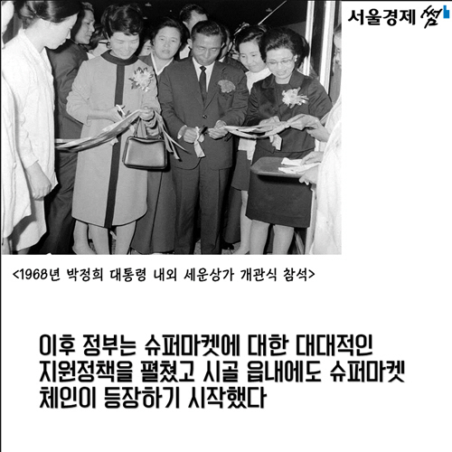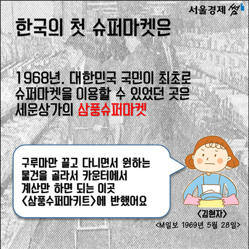 한국에는 ‘킹 컬렌’이 등장한 지 34년이 지나서야 슈퍼마켓이 등장했습니다. 1964년 외국인을 대상으로 한 포리너슈퍼마켓이 있었지만 사실상 최초의 슈퍼마켓은 1968년 내국인을 대상으로 한 삼풍슈퍼마켓입니다.