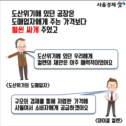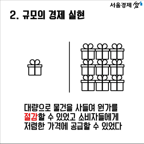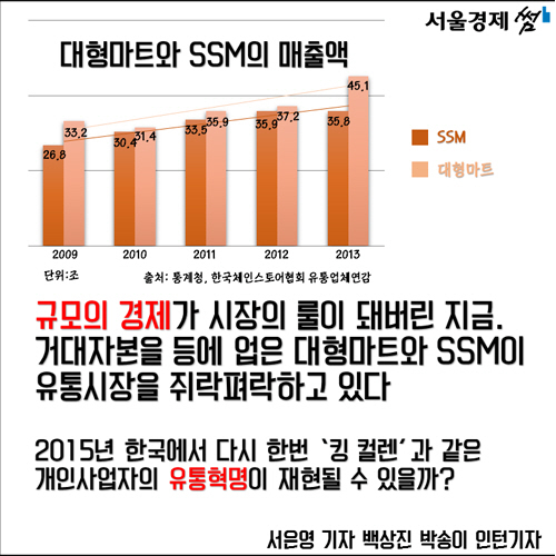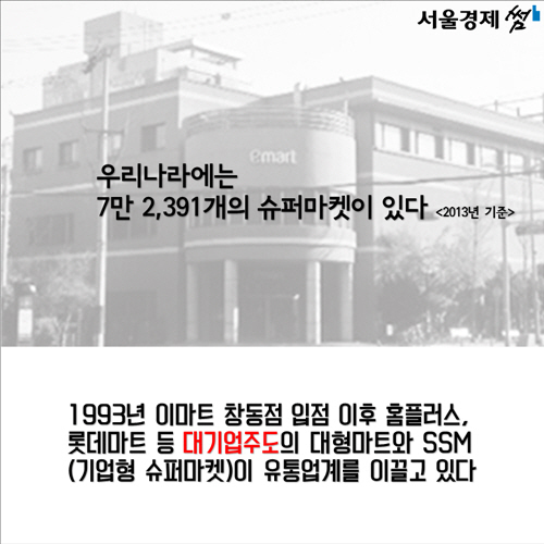 그로부터 약 40년이 흐른 지금 슈퍼마켓은 더 이상 특이한 유통형태가 아닙니다. 2013년 기준 우리나라에는 7만2,391개에 달하는 슈퍼마켓이 있습니다. 특히 1993년 이마트 창동점이 생긴 이후 대형마트와 기업형 슈퍼마켓은 가장 대표적인 유통형태로 자리잡았습니다. 대량 구매로 값을 낮추는 규모의 경제는 당장 소비자들에게 이롭다고 여기기 쉽지만 골목상권의 생존을 위협해 궁극적으로는 새로운 유통 모델의 등장을 막을 수도 있습니다. 2015년 대한민국에서 킹 컬렌과 같은 작은 유통혁명이 다시 한번 재현되기 어렵다고 보는 이유입니다.