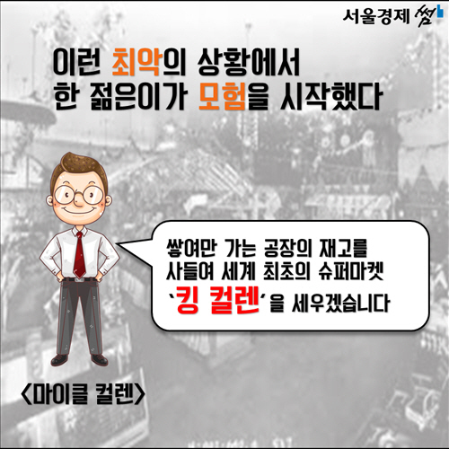 1930년 8월4일 뉴욕시 변두리 퀸스의 자메이카 거리. 이곳에 최초의 슈퍼마켓인 ‘킹 컬렌(King kullen)’이 등장합니다. 당시는 전세계적인 대공황 속에 24%에 달하는 살인적인 실업률로 모두가 고통받던 시기. 그런데도 아일랜드계 청년 마이클 컬렌(Michael kullen)은 많은 사람들의 우려 속에 다소 무모한 도전을 감행합니다. 네 맞습니다. 예상대로 ‘킹 컬렌’은 마이클 컬렌이라는 이 무모한(?) 청년의 작품입니다.