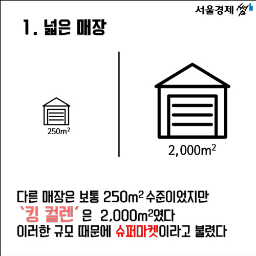 첫째는 넓은 매장. 다른 매장의 크기는 보통 250㎡ 수준이었지만 ‘킹 컬렌’은 2,000㎡나 되는 규모로 많은 물건을 진열할 수 있었습니다. 거대한 규모 때문에 사람들은 ‘킹 컬렌’을 슈퍼마켓으로 부르게 되었습니다.