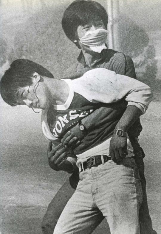 87년 6월9일 연대 교문앞 학생과 경찰간에 화염병,최루탄이 오가고 공방이 벌어졌다. 20m앞에서 한 학생이 머리에 손을 올리고 비틀거렸다. 최루탄을 맞은 듯 했다. 고통스러워 하는 학생을 또 다른 학생이 뒤에서 껴안으며 일으켜 세웠다. 모터드라이브를 사용, 20컷을 순식간에 찍었다. 학생은 절망적으로 보였다. 이 한 장의 사진은 6ㆍ10항쟁의 기폭제가 되었다.