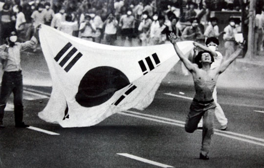 나는 사진기자로서 현장에 대한 욕심이 많아 큰 집회가 있을 때는 자원해서 가는 편이었다. '나의 조국'을 찍은 87년 6월26일도 마찬가지였다. 부산은 당시 물고문으로 죽은 박종철군의 고향이었기 때문이다. 시위현장을 물어물어 찾아가 공사중인 역에 올라가 사진을 찍으려는데 예상치 못한 장면이 연출됐다. 딱 한 컷을 찍고 보니 태극기가 젖혀져 버렸다. 사진을 찍으면서 '바로 이거다'라고 생각했다. 하지만 사진이 너무 자극적이라는 이유로 다음날 지면에 실리지는 못했다.