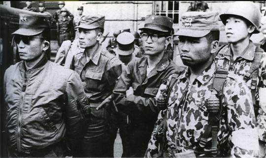 61년 5월18일 혁명을 지지하는 육사생도를 사열하고 있는 쿠데타 주역들의 사진. 김천길 기자는 생도들이 시청 앞을 통과할 때 박정희를 둘러싸고 있는 청년 장교들의 모습에 이상한 긴장감이 흘러 셔터를 눌렀다고 했다. 이 사진은 혁명주체의 상징이 됐고, 이 사진 속의 인물중 일부는 20년 후 흉탄에 생을 마감하는 비운을 맞았다.