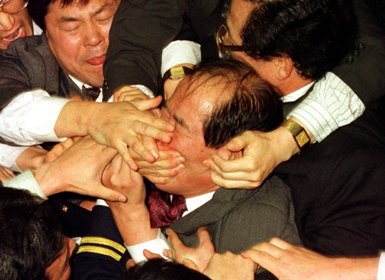 예산안처리 법정 시한인 93년 12월2일, 예산안 및 추곡수매안을 둘러싸고 여야가 팽팽한 대립을 하고 있었다. 민자당 의원들이 황낙주 부의장을 앞세우고 들어오자 민주당 의원들도 힘으로 밀어붙였다. 황부의장은 목이 감기고 입이 막혀 있었다. 나는 '저러다 황부의장이 죽는게 아닌가'하는 생각이 들었다. 사방에서 플래시 불빛이 터졌고, 나도 연속으로 석 장을 눌렀다.
