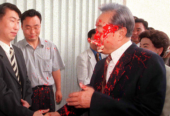 99년 6월3일. 김영삼 전대통령의 방일(訪日)이 예정돼 있었다. 공항에 도착해 뷰파인더를 들여다 보면 사진을 찍고 있는데 무언가 공중으로 날아가고 있다는 느낌이 들어 반사적으로 셔터를 눌렀다. 달걀 안에 든 붉은 페인트로 YS의 얼굴은 범벅이 됐고, 범인은 경호원들에게 끌려갔다. 회사로 돌아와 필름을 현상해 보니 두번째 컷에 그 장면이 잡혀있었다. 달걀을 맞는 YS의 얼굴은 사태파악을 못한 듯 웃고 있었고, 손명순 여사도 웃고 있었다. 내 평생 잊지 못할 1/250초의 짧은 순간이었다.
