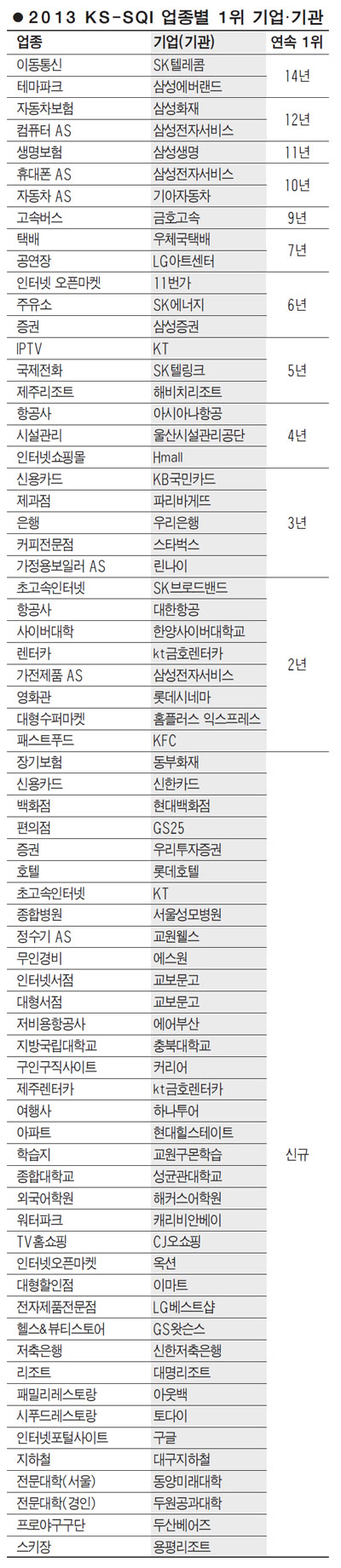 삼성전자서비스는 컴퓨터 AS(12년 연속), 휴대폰 AS(10년 연속), 가전제품 AS(2년 연속) 등 3개 업종에서 1위에 올랐고 KT는 IPTV(5년 연속), 초고속인터넷 등 2개 업종에서 1위를 차지했다. 그룹사별로는 삼성그룹이 9개 업종에서 1위를 휩쓸었고 SK그룹이 5개 업종, KT그룹이 4개 업종, 금호아시아나그룹이 3개 업종에서 왕좌에 올랐다.