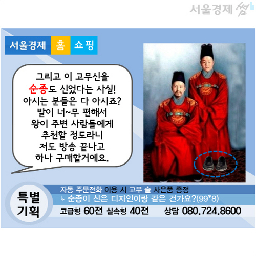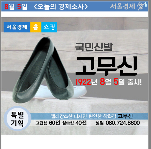 고무신을 국내에 처음 소개한 업체는 대륙고무주식회사다. 제품 출시 첫 날 이 회사는 ‘대륙고무가 고무신을 출매함에 있어 이왕(李王)께서 이용하심에 황감함을 비롯 여관(女官) 각 위의 애용을 수하야’라는 신문광고를 실었다. 여기서 이왕은 순종으로, 한국인으론 최초로 고무신을 신었다고 기록돼 있다. 순종은 발이 편하다며 고무신을 주위 사람에게도 적극 권했다고 한다.
