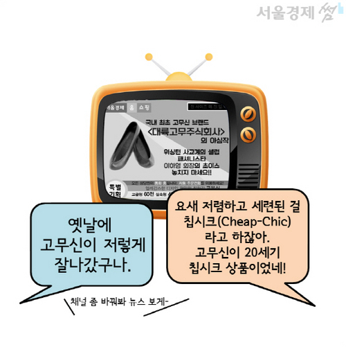 최근 경기침체가 길어지며 소비 트렌드가 변하고 있다. 비싼 프리미엄 제품보다 합리적인 가격(cheap)과 세련된 디자인(chic)을 겸비한 ‘칩시크(Cheap-Chic)’ 제품들이 각광받고 있다. 돈 없는 서민들의 발이 돼 주었던 고무신은 20세기초를 풍미한 ‘칩시크’ 였다.  , 김현주인턴기자
