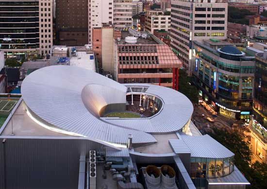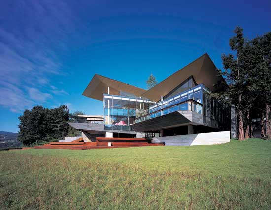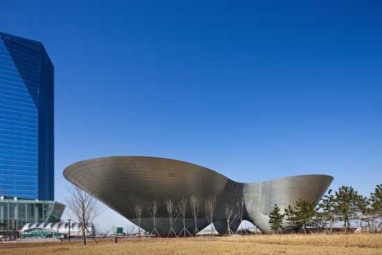 건축적인 조형성과 함께 그 구조적으로 대담한 시도가 돋보이는 작품이다. 장방형의 수공간(reflecting pond)위에 3개의 접시(Tri-bowl)로 구성한 건축적인 시도는 조형성과 함께 구조적인 긴장감을 만들어내고 있다. 진입레벨에서는 수면을 따라 브릿지로 이동하면서 보이는 역원추형 구조물들 사이의 외부공간은 수면에 비추이는 효과로 인하여 건축물의 강력한 인상을 만들어내고 있다. 내부공간은 3개의 역원추형 bowl이 결합된 무주공간으로 구성되어 있으며, 전시장에 필수적이라고 이해하는 평탄한 바닥은 곡면의 벽면을 따라 물흐르듯 놓여진 다양한 레벨의 수평판들로 조직되어 바닥이 전시물의 수용으로부터 해방됨에 따라 대형 설치작품과 영상전시, 행위예술 및 공연을 동시에 수용할 수 있는 풍요롭고, 융통성있는 공간이 되었다. 시공상의 어려움에도 불구하고 건축사의 설계의도를 충분히 반영한 시공의 완성도도 높이 평가된다.