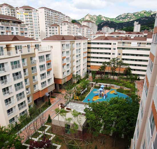 경사진 지형의 원형에 순응하며 아파트의 주동타입이 디자인되어 단지의 경관을 주변의 자연과 함께 만들어 내고 있다. 급경사 부지에 위치한 주동을 아파트와 테라스하우스를 복합하여 계획하고 완만한 부분은 중정을 가진 블록형 아파트를 배치했다. 고층 아파트와 테라스하우스가 복합되어진 부분의 동선처리와 조형적 디자인의 배려가 요구된다.