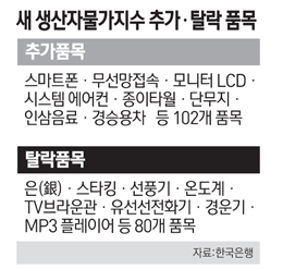 은(銀)∙스타킹∙선풍기∙온도계∙자동판매기 등은 거래액 감소를 이유로 제외됐다. TV 브라운관, 유선전화기, 경운기, MP3플레이어 등 수요가 적거나 없어진 것들도 빠졌다.