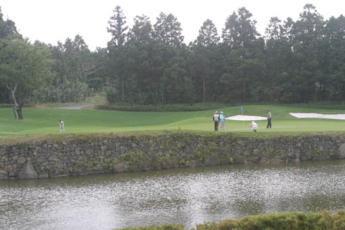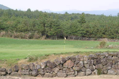 파3홀은 아일랜드 그린과 계곡을 넘겨 쳐야하는 홀 깊은 벙커로 무장된 곳 ,화산 바위 속에 그린이 있는데다가 제주특유의 바람과 한라산 마운틴 브레이크로 인해 쉽게 파(par)를 잡을 수 없다.