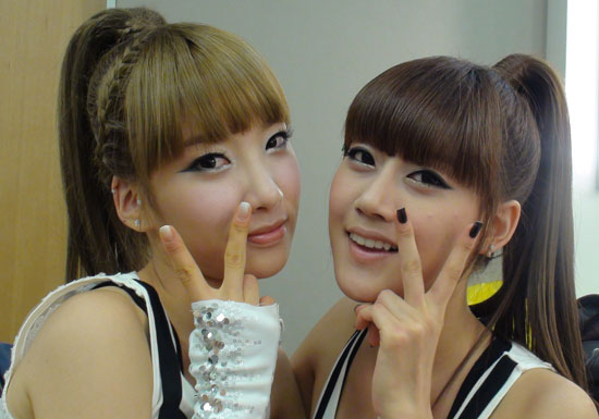 지숙(왼쪽)과 승아가 대기실에서 나란히 포즈를 취했다. 뻗은 손가락 크기와 비교될만한 이기적인 얼굴 크기. 진정 부럽소.