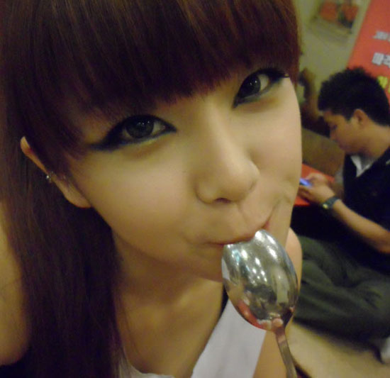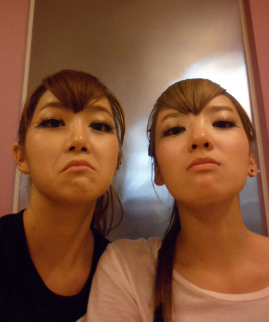 우리(왼쪽)와 지숙이 색다른(?) 모습을 카메라에 담았다. 앞머리를 한데 모아 마치 '깻잎' 한 장을 머리 위에 올려놓은 듯한 모습이다. 엽기 컨셉트에 걸맞은 설정 표정도 압권. 일본 만화에 등장하는 주인공 캐릭터 같다.