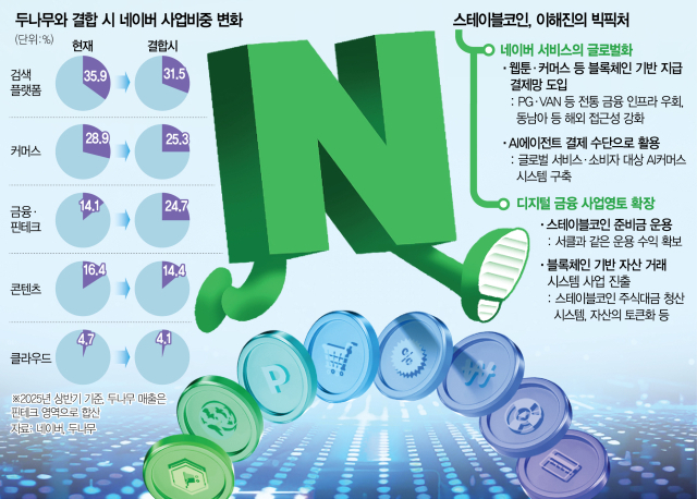 이 의장이 두나무와의 협업을 통해 그리는 네이버의 사업 전략은 △모든 사업의 글로벌화 △새로운 금융 인프라 시장 선점이라는 두 축이다. 이 의장이 보는 네이버의 미래에는 국경이 없다. 네이버가 두나무와 손잡고 스테이블코인을 발행·운영할 경우 기존 네이버페이나 신용카드 기반 지급 결제 시스템과 별도의 지급 시스템을 구축할 수 있게 된다. 이를 웹툰이나 콘텐츠·쇼핑에 연계할 경우 해외 어디서나 결제와 지급이 가능해 사실상 해외 진출 효과가 가능한 구조다. 김갑래 자본시장 연구원 선임연구원은 “신용카드나 지급 결제 시스템이 잘되고 있는데 굳이 스테이블코인이 필요하느냐는 지적이 있지만 이용자 입장에서도 수수료가 저렴해지고 결제 장벽이 낮아진다”며 “특히 신용카드 이용을 위해 필요한 전자결제대행사(PG)나 밴(VAN)사가 없어도 되기 때문”이라고 말했다. 이는 금융 인프라가 구축되지 않은 나라에도 네이버가 온라인 커머스 사업을 할 수 있는 기반을 갖추게 된다는 의미다.