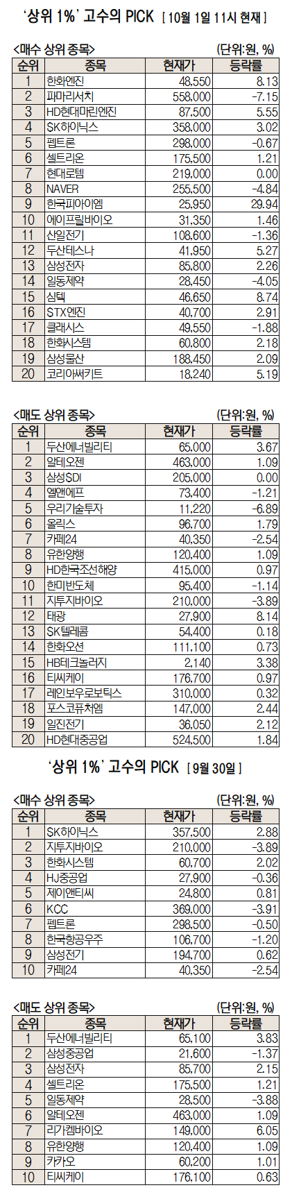 이날 미래에셋증권에 따르면 미래에셋증권 주식 거래 고객 중 최근 1개월간 투자 수익률 상위 1%에 해당하는 ‘주식 초고수’들이 오전 11시까지 가장 많이 사들인 종목은 한화엔진이다.