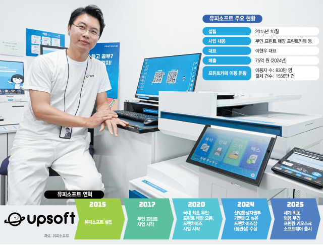 이현우 유피소프트 대표는 1일 서울 성동구 유피소프트 본사에서 서울경제신문과 만나 “기존 유피소프트는 단순히 무인 매장 운영에 필요한 최소 기술만 가졌다”며 “이제는 제조사에 상관없이 모든 프린터에 탑재하는 무인 프린트 범용 솔루션을 확보한 기업으로 탈바꿈했다”고 밝혔다.