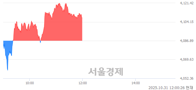 31일 오후 12시 0분 현재 코스피는 전일 대비 21.08p(+0.52%) 오른 4107.97로, 43(매도):57(매수)의 매수우위를 기록 중이다.