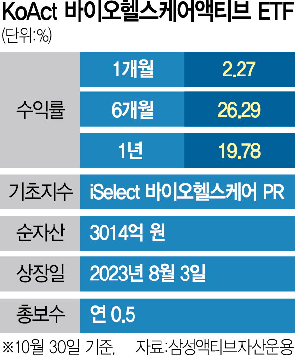 삼성액티브자산운용의 ‘KoAct 바이오헬스케어액티브’는 바이오와 헬스케어 업종에 집중 투자하는 국내 최초의 액티브 ETF다. 고령화 시대를 맞아 인공지능(AI) 기술 융합을 통해 고성장이 기대되는 바이오헬스케어 기업을 발굴한다. 재무지표와 산업 데이터 분석을 기반으로 애널리스트 리서치와 기업 탐방을 병행해 성장 잠재력이 높은 종목을 선별한다.