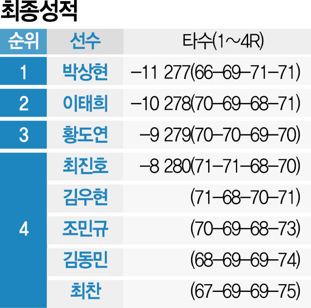 2타 차 공동 4위로 출발한 박상현은 강한 바람을 뚫고 버디 5개와 보기 4개로 1타를 줄였다. 17번 홀(파3) 티샷을 그린사이드 벙커 입구로 보내 보기를 적고 이태희와 동타가 됐지만, 18번 홀 페어웨이에서 131m를 남기고 친 두 번째 샷을 핀 4.5m에 멈춰 세워 기회를 잡았다. 이태희는 벙커에서 친 샷이 짧아 핀이 꽂힌 2단 그린에 볼이 올라가지 못했다. 이태희의 버디 실패 뒤 박상현은 쉽지 않은 버디를 넣고 포효했다.
