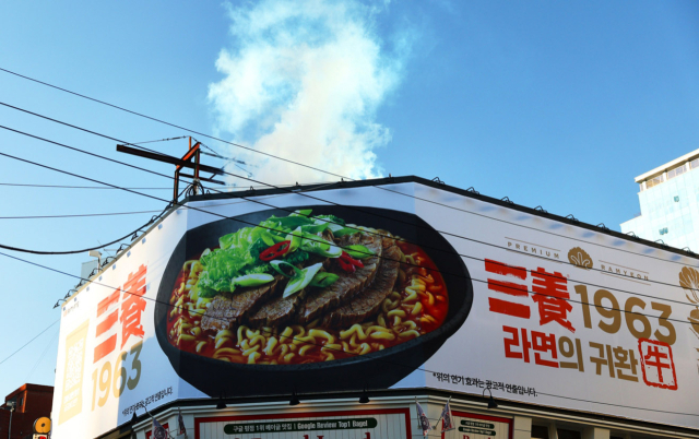 삼양식품이 신제품 '삼양1963' 출시를 기념해 오는 26일까지 서울 성동구 성수동에서 옥외광고 캠페인을 진행한다고 19일 밝혔다. '삼양1963' 옥외광고 캠페인은 수증기 장치를 활용해 갓 끓인 '삼양1963'에서 김이 피어오르는 모습을 구현한 점이 특징이다. 삼양식품은 라면 특유의 따뜻함을 시각적으로 보여주는 연출을 통해 제품의 이미지를 직관적으로 전달하고, 소비자가 감성적으로 브랜드를 경험할 수 있도록 했다. '삼양1963'은 삼양브랜드를 통해 처음으로 선보이는 프리미엄 미식 라면으로 과거 삼양라면 제조 레시피의 핵심이었던 우지를 활용해 면의 고소한 맛과 국물의 깊은 맛을 끌어올려 차별화된 풍미를 구현했다. 사진제공=삼양식품