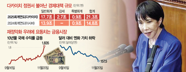 중국과의 갈등이 걷잡을 수 없이 증폭되는 상황에서 고물가 대응을 위한 ‘확장재정 정책’은 금융시장에 불안감을 안기고 있다. 다카이치 내각은 당초 예상됐던 17조 엔보다 많은 21조 3000억 엔 규모의 종합 경제 대책을 추진 중이다. 예산 확보를 위해 채권을 추가 발행할 것이라는 전망이 지배적인 가운데 이날 일본 10년물 국채 수익률은 1.8%를 넘기며 17년 만에 최고치(채권 가격 급락)를, 30년물은 역대 최고인 3.37%를 기록했다. 외환시장에서 엔화 매도도 이어지며 전날 뉴욕 외환시장에서 엔·달러 환율은 157엔대까지 올라 10개월 만의 ‘엔저’를 나타냈다. 니혼게이자이신문은 “엔저나 금리 상승은 물가를 올려 다카이치 정권의 경제 대책 효과를 갉아먹을 수 있다”고 설명했다. 블룸버그통신도 “정책 신뢰가 사라질 경우 투자자는 일본 자산의 모든 것을 팔기 시작할 것”이라고 경고했다. 21일 경제 대책 발표를 앞두고 일본 주식·국채·엔화가 동시에 빠지는 ‘트리플 하락’이 본격화할 수 있다는 전망도 나온다. 이밖에도 다카이치 총리는 유신회와 약속한 ‘중의원 10% 감원’ 과제를 안고 있다. 자민당 내부에서 ‘쉽지 않을 것’이라는 목소리가 나오는 가운데 세부 논의 과정에서 연정 내부의 균열 및 갈등이 ‘숨은 뇌관’이다.