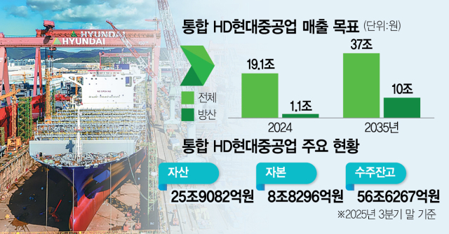 특히 HD현대중공업은 글로벌 1위인 중·대형 조선사를 합병하면서 창출되는 시너지를 토대로 차별화된 경쟁력을 확보해나갈 예정이다. HD현대는 HD현대중공업이 ‘마스가(MASGA·미국 조선업을 다시 위대하게) 프로젝트’의 선봉에 서면서 방산 분야 사업의 경쟁력을 강화해나갈 것으로 보고 있다. 특히 HD현대중공업이 보유한 함정 건조 기술 노하우에 군함 건조에 적합한 HD현대미포의 도크와 설비·인적 역량을 결합하면 2035년까지 방산 부문 매출을 약 10배인 10조 원까지 확대할 수 있다는 포부다.