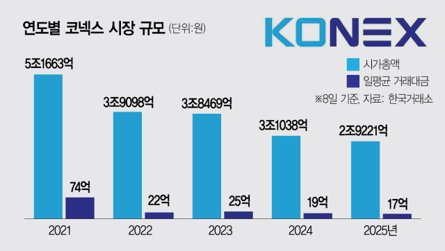 시장 확대 기능이 활력을 잃으면서 외형 확장 능력 역시 크게 약화한 것으로 드러났다. 올해 코넥스 신규 상장은 3건에 그쳤으며, 이는 지난해 6건 대비 절반 수준이다. 신규 상장 시가총액은 435억 원으로 지난해(2674억 원)의 16% 수준에 머무르는 등 초기자금 조달 시장으로서 역할도 축소됐다. 전체 시가총액 역시 꾸준히 하락해 3조 원 선을 지키지 못하고 현재 2조 9221억 원으로 내려앉은 상태다.