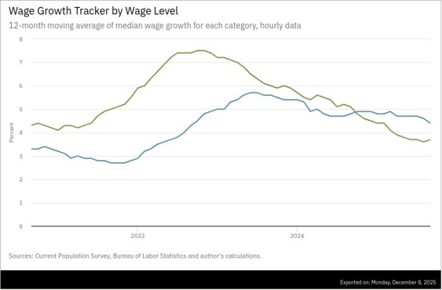 애틀랜타연방준비은행에 따르면 9월 미국 소득 하위 25% 계층의 시간당 임금 상승률은 전년 대비 3.7%로, 2022년 7%를 넘었던 수준에서 큰 폭으로 하락했습니다. 반면 상위 25% 계층의 임금 상승률은 4.4%로 견조한 흐름을 유지했습니다. 특히 상위 계층의 임금 상승률은 지난해 10월부터 하위 계층을 앞지르며 노동시장 양극화가 심화되고 있습니다.