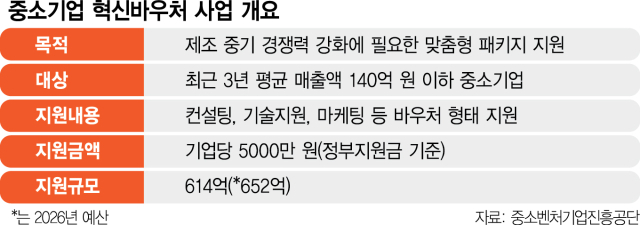 9일 중진공에 따르면 중소기업 혁신바우처 사업이 기업의 기술 고도화에 실질적인 도움을 주고 있다. 해당 사업은 제조 중소기업이 경쟁력 강화에 필요한 컨설팅·기술지원·마케팅을 서비스 수행기관을 통해 제공받을 수 있도록 바우처 형태로 지원하는 프로그램이다. 지원 대상은 최근 3년 평균 매출액이 140억 원 이하인 제조 중소기업이다. 기업당 정부 지원금은 최대 5000만 원 까지다. 사업 예산은 내년 652억 원(정부안 기준)으로 올해 614억 원 대비 38억 증액된다.