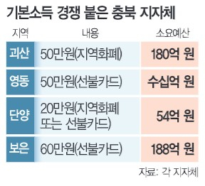 10일 관계 부처와 지자체에 따르면 이런 현상이 가장 극명하게 드러난 곳은 충북이다. 구체적인 액수를 뜯어보면 ‘출혈경쟁’이라는 말이 무색하지 않다. 농어촌 기본소득 시범 사업 공모에서 고배를 마신 보은군(1인당 60만 원), 괴산군(50만 원), 영동군(50만 원), 단양군(20만 원) 등 4개 지자체는 탈락 직후 약속이나 한 듯 자체적인 현금성 지원책을 검토하거나 확정했다. 인구 3만 5000여 명인 괴산군의 경우 이 지원금 예산만 180억 원에 달하며 단양군 역시 54억 원의 군비를 쏟아부을 예정이다. 보은군이 편성한 민생회복지원금 188억 원은 보은군의 연간 지방세 수입(약 260억 원)의 70%에 육박하는 규모다.