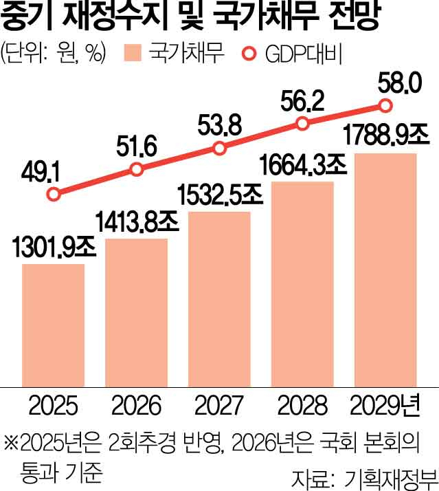 지방의 방만함이 뼈아픈 것은 최후의 보루여야 할 중앙정부의 곳간 사정마저 위험 수위를 넘나들고 있기 때문이다. 기획재정부의 ‘2025~2029년 중기재정운용계획’에 따르면 우리나라 국가채무는 내년에 처음으로 1400조 원을 돌파한다. 문제는 증가 속도다. 국가채무는 2026년 1413조 8000억 원, 2027년 1532조 5000억 원으로 매년 100조 원 이상 불어나고 2029년에는 무려 1788조 9000억 원에 달할 것으로 전망된다. 불과 4년 만에 나랏빚이 약 500조 원 가까이 폭증한다는 의미다. 이에 따라 국내총생산(GDP) 대비 국가채무비율 역시 2025년 49.1%에서 2029년 58.0%로 수직 상승하게 된다. 국제통화기금(IMF)도 최근 보고서에서 한국의 GDP 대비 일반정부 부채비율(53.4%)을 경고했다.